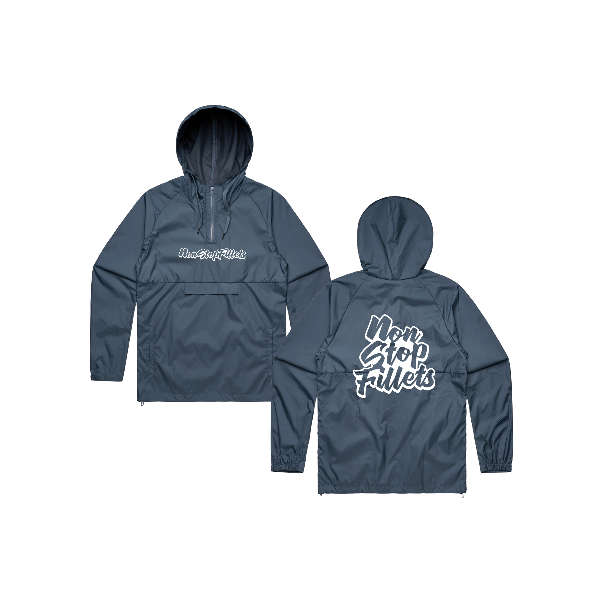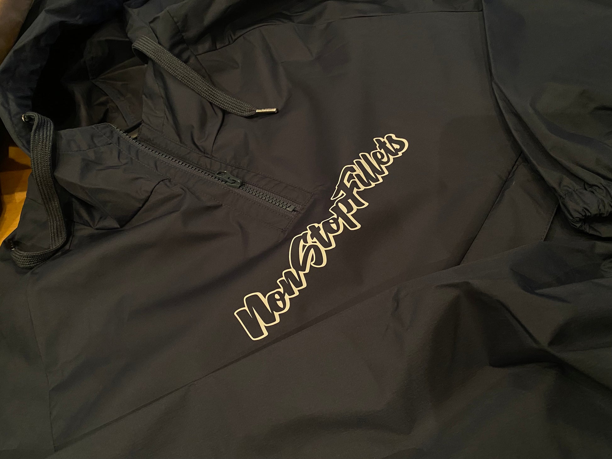 Pullover zip-up hooded windbreaker, rubber headphone patch, adjustable elastic drawcord at hem, 2 side pockets